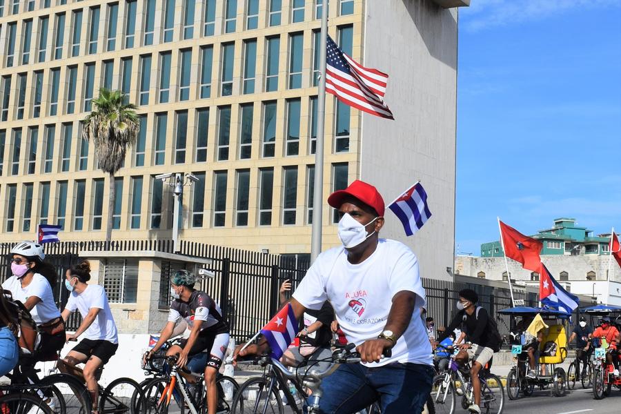People participating in a rally against U.S. embargo pass by the U.S. embassy in Havana, Cuba, Aug. 5, 2021. (Xinhua/Zhu Wanjun)