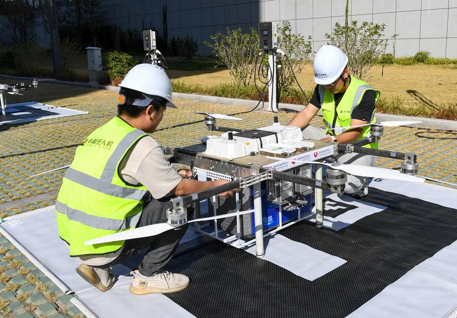Staff members check a blood transportation drone before its departure at the Shenzhen Blood Center in Shenzhen, south China's Guangdong Province, Jan. 19, 2024. (Xinhua/Mao Siqian)