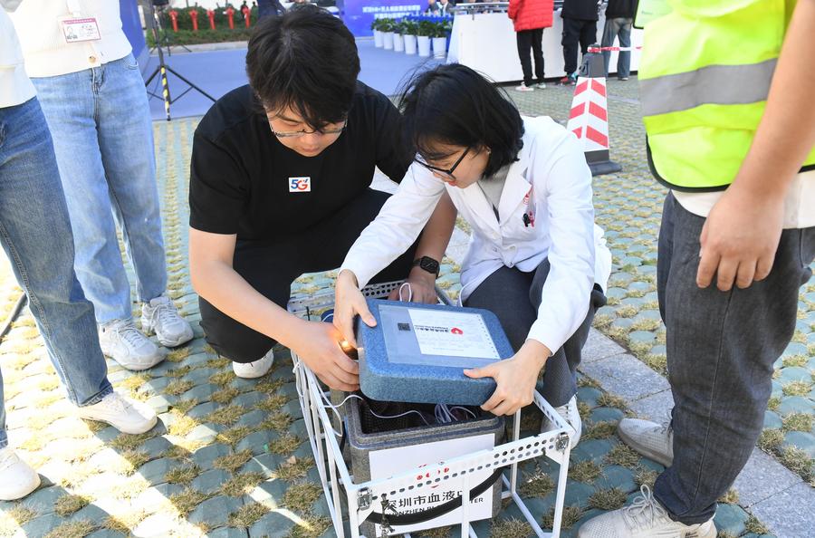 SHENZHEN, Jan. 19 (Xinhua) -- A blood transportation drone platform, the first of its kind in Shenzhen, was officially put into use on Friday. Integrating 5G technology and artificial intelligence, the platform has helped ensure safety and improved efficiency of blood transportation.