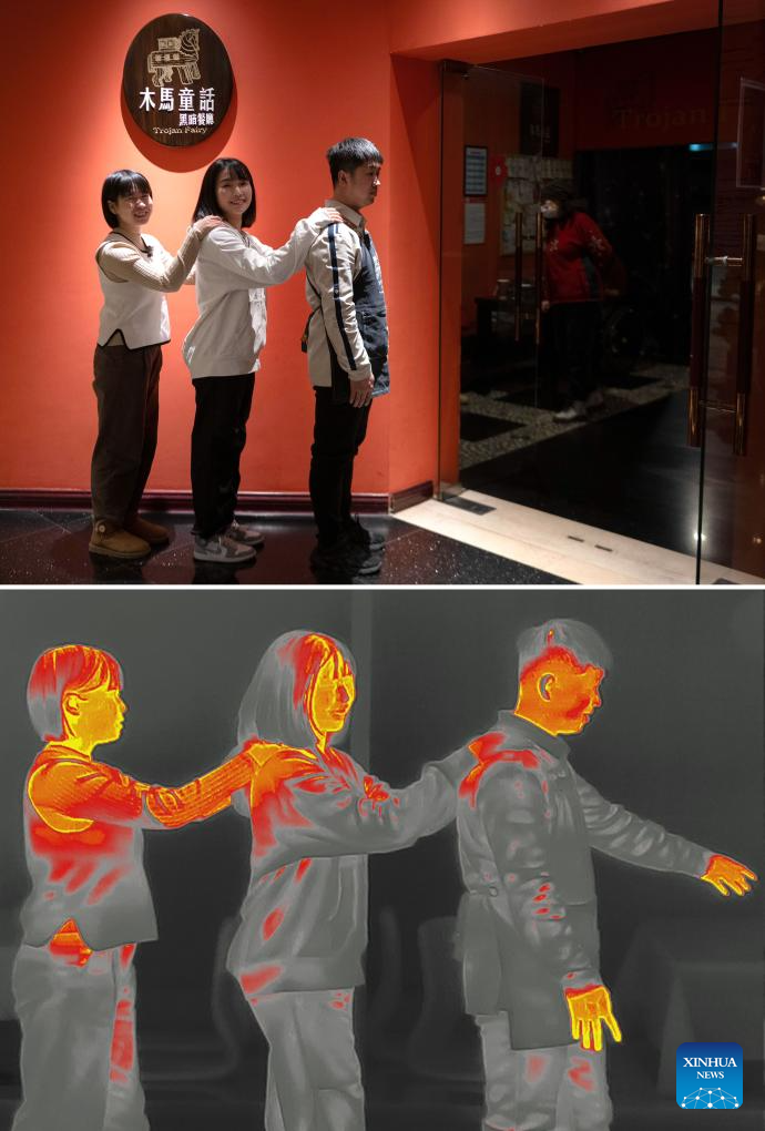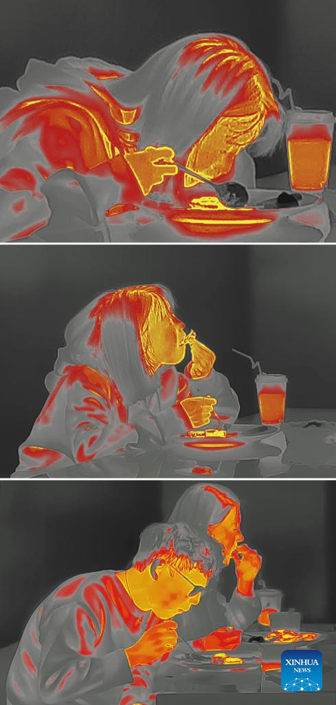 This combo photo taken by a thermal imaging camera shows people dining at Trojan Fairy in Beijing, capital of China, Dec. 24, 2023. (Xinhua/Yin Gang)