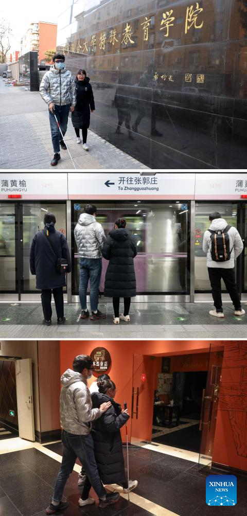 This combo photo shows Zhi Ming (R) and her lover Yang Demin, both visually impaired employees, leaving Special Education College of Beijing Union University in Beijing, capital of China, Dec. 22, 2023 (above) and Zhi Ming (2nd, R) and Yang Demin waiting for a subway on the platform in Beijing, Dec. 22, 2023 (middle) and Zhi Ming (R) and Yang Demin arriving at Trojan Fairy in Beijing, Dec. 22, 2023 (below). They work as music performers and ushers at Trojan Fairy. (Xinhua/Cai Yang)