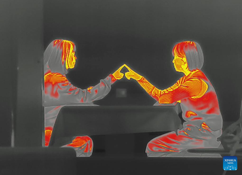 This photo taken by a thermal imaging camera shows diners trying to touch each other's finger in the complete dark at Trojan Fairy in complete darkness in Beijing, capital of China, Dec. 24, 2023. (Xinhua/Cai Yang)