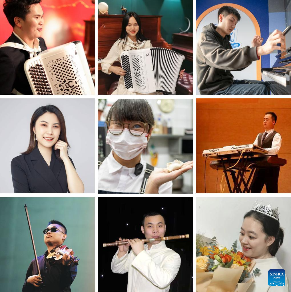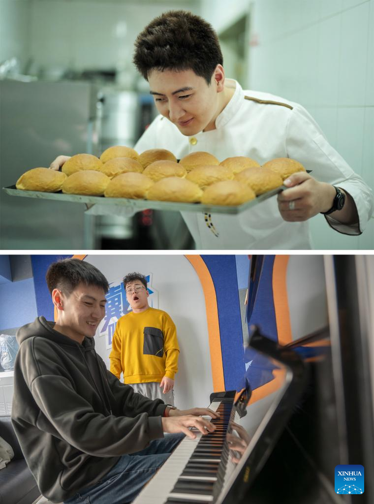 This combo photo shows Zhou Haoyu, visually impaired employee, smelling the bread he makes at Trojan Fairy in Beijing, capital of China, June 5, 2019 (above) and Zhou accompanying a student on the piano at a training agency for art examinations in Beijing, Jan. 17, 2024 (below, Xinhua/Cai Yang). (Xinhua)