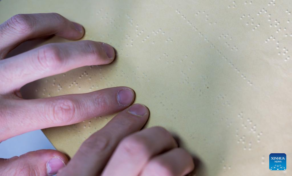 Visually impaired Zhou Haoyu demonstrates the lyrics of Italian songs recorded in Braille, in Beijing, capital of China, Jan. 17, 2024. (Xinhua/Cai Yang)