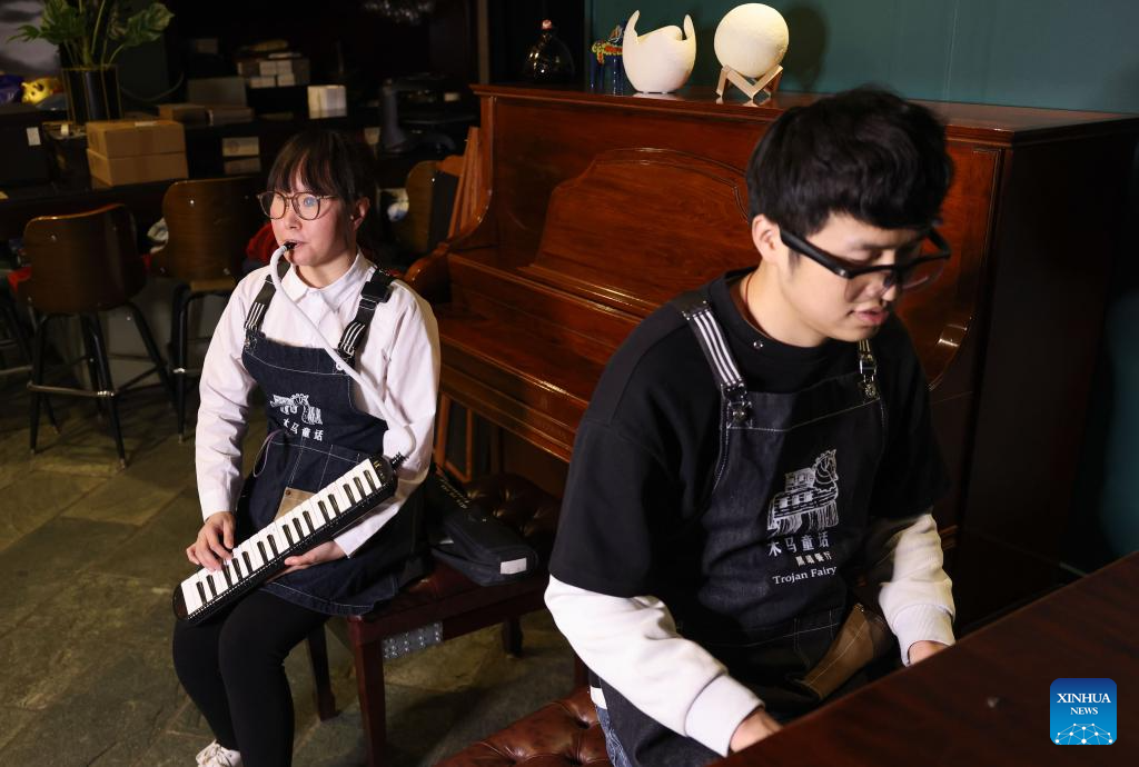 Zhi Ming (L) and Yang Demin, both visually impaired employees, perform at Trojan Fairy in Beijing, capital of China, Dec. 22, 2023. (Xinhua/Yin Gang)