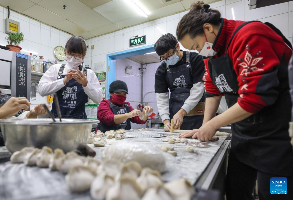 Restaurant founder Yu Shuang (1st, R), visually impaired Yang Demin (2nd,R), physically disabled He Ning (3rd, R) and visually impaired Zhi Ming (4th, R) make dumplings in the kitchen of Trojan Fairy on the occasion of winter solstice in Beijing, capital of China, Dec. 22, 2023. (Xinhua/Yin Gang)