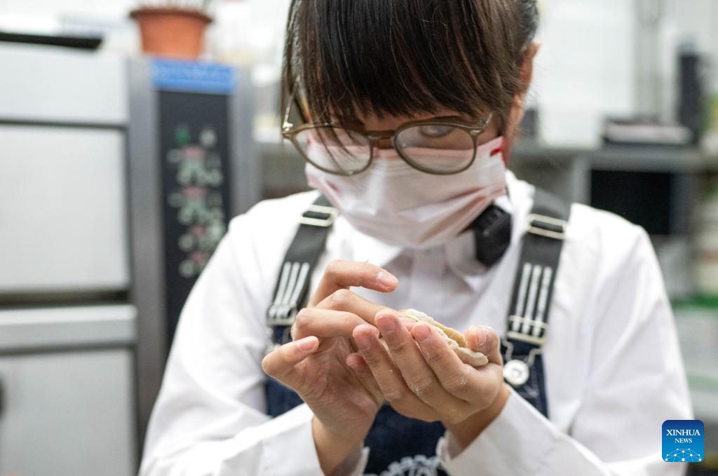 Zhi Ming, a visually impaired employee, makes dumplings in the kitchen of Trojan Fairy in Beijing, capital of China, Dec. 22, 2023. (Xinhua/Cai Yang)