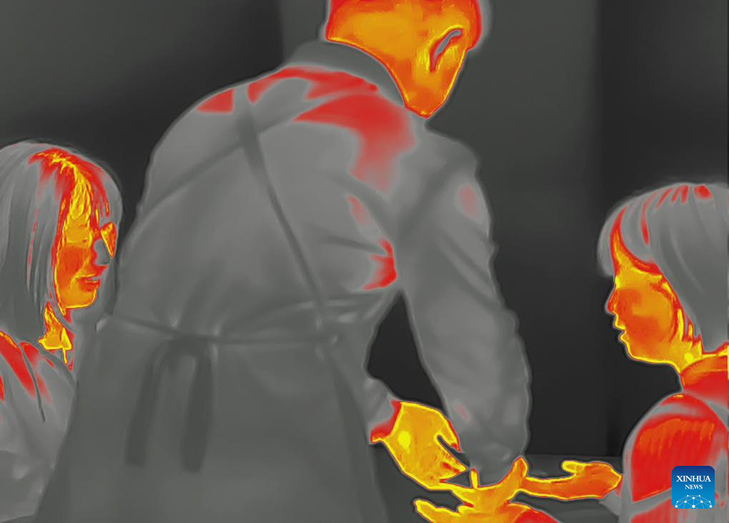 This photo taken by a thermal imaging camera shows a waiter serving dishes at Trojan Fairy in Beijing, capital of China, Dec. 24, 2023. (Xinhua/Cai Yang)