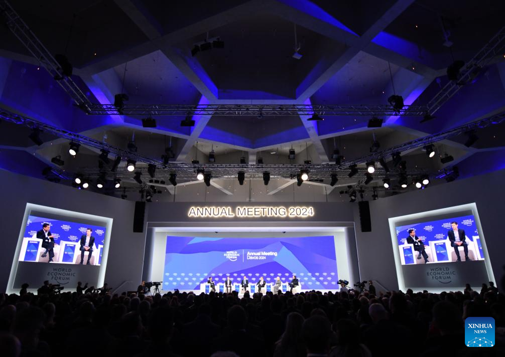 Participants attend the session "Technology in a Turbulent World" during the World Economic Forum (WEF) Annual Meeting 2024 in Davos, Switzerland, Jan. 18, 2024. Under the theme "Rebuilding Trust," the 54th WEF Annual Meeting is held here from Jan. 15 to 19. (Xinhua/Lian Yi)