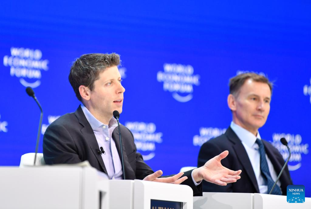 OpenAI CEO Sam Altman (L) speaks at the session "Technology in a Turbulent World" during the World Economic Forum (WEF) Annual Meeting 2024 in Davos, Switzerland, Jan. 18, 2024. Under the theme "Rebuilding Trust," the 54th WEF Annual Meeting is held here from Jan. 15 to 19. (Xinhua/Lian Yi)