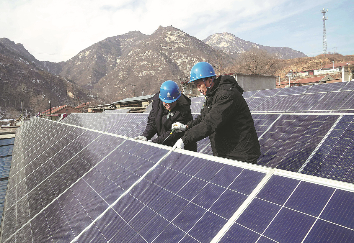 Workers from State Grid check and repair photovoltaic panels in Shijiazhuang, Hebei Province, on Jan 14. YANG SHIYAO/XINHUA
