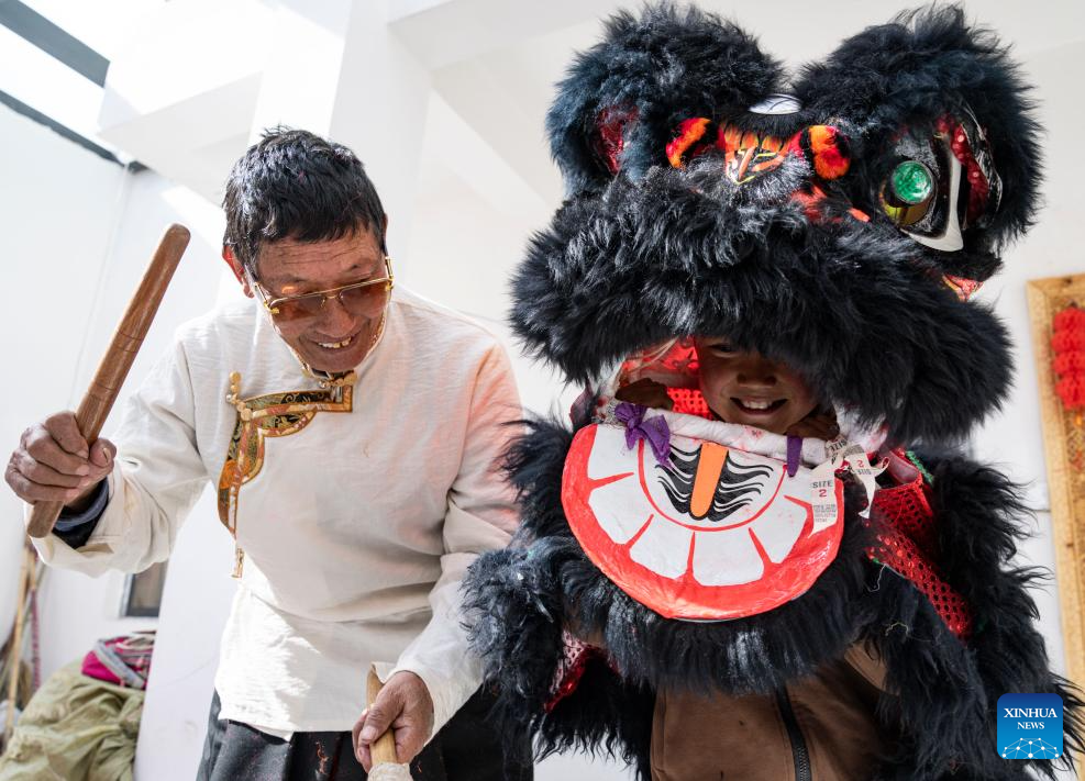 Tengpa Anye (L) performs lion dance with his grandson in Xobando Town of Lhorong County in Qamdo City, southwest China's Xizang Autonomous Region, Jan. 19, 2024. (Xinhua/Sun Fei)