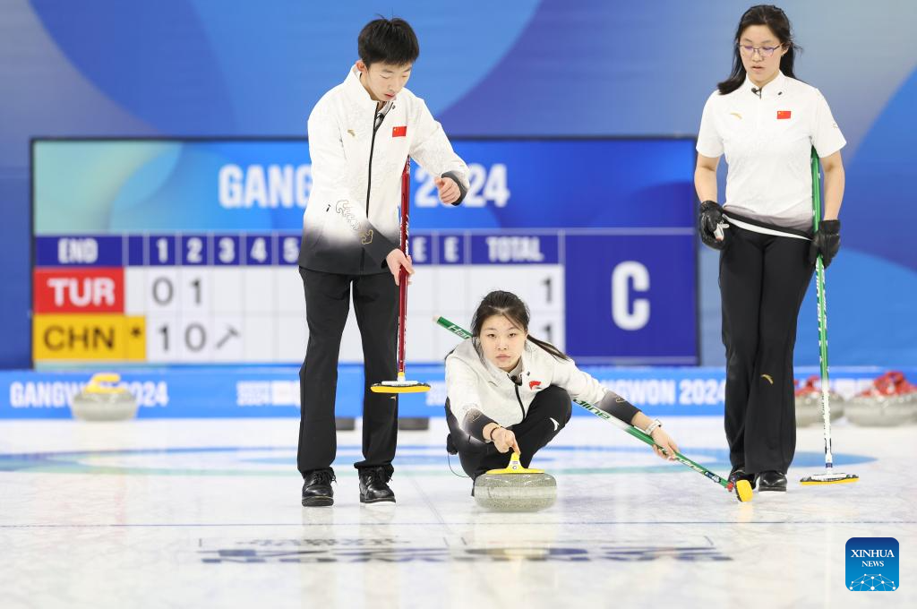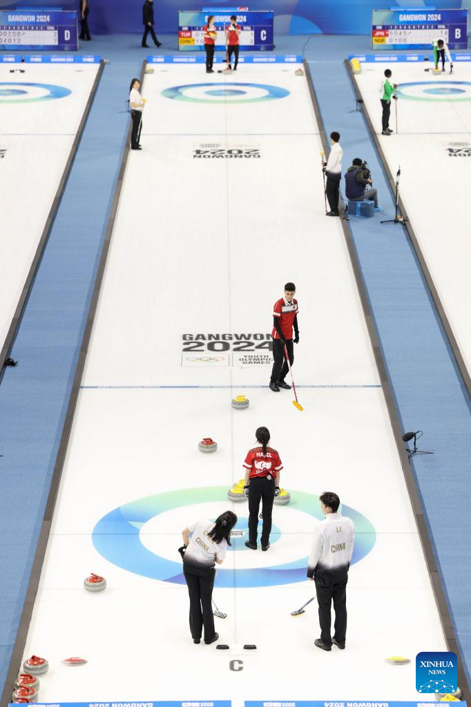 Athletes compete during the curling mixed team round robin session 1 match between Trkiye and China at the Gangwon 2024 Winter Youth Olympic Games at Gangneung Curling Centre, South Korea, Jan. 20, 2024. (Xinhua/Hu Huhu)