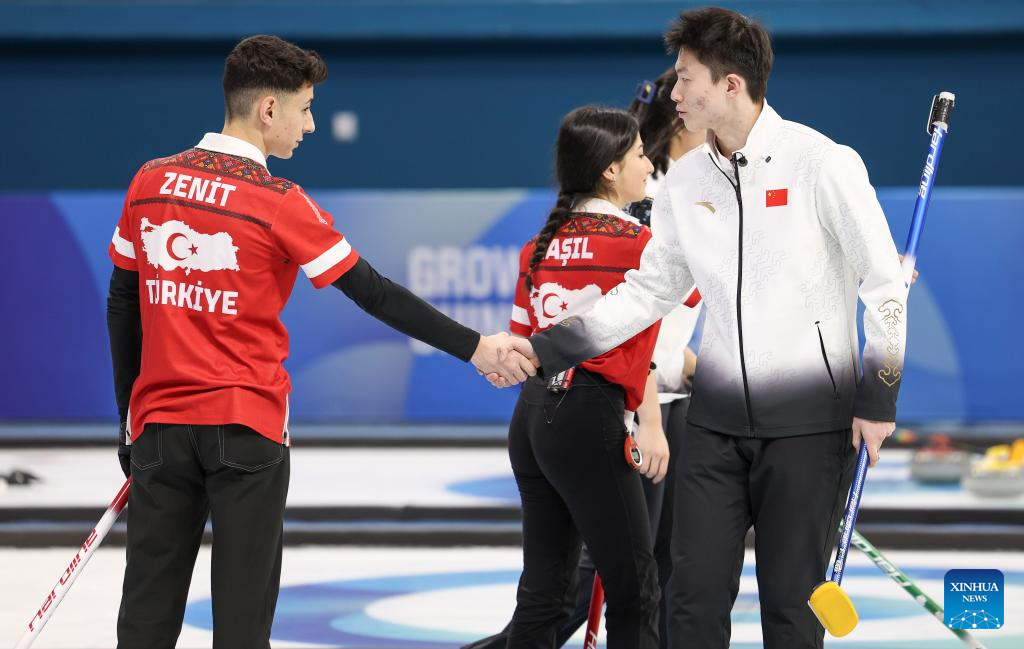 Muhammed Taha Zenit (L) of Trkiye and Li Zetai of China shake hands after the curling mixed team round robin session 1 match between Trkiye and China at the Gangwon 2024 Winter Youth Olympic Games at Gangneung Curling Centre, South Korea, Jan. 20, 2024. (Xinhua/Hu Huhu)