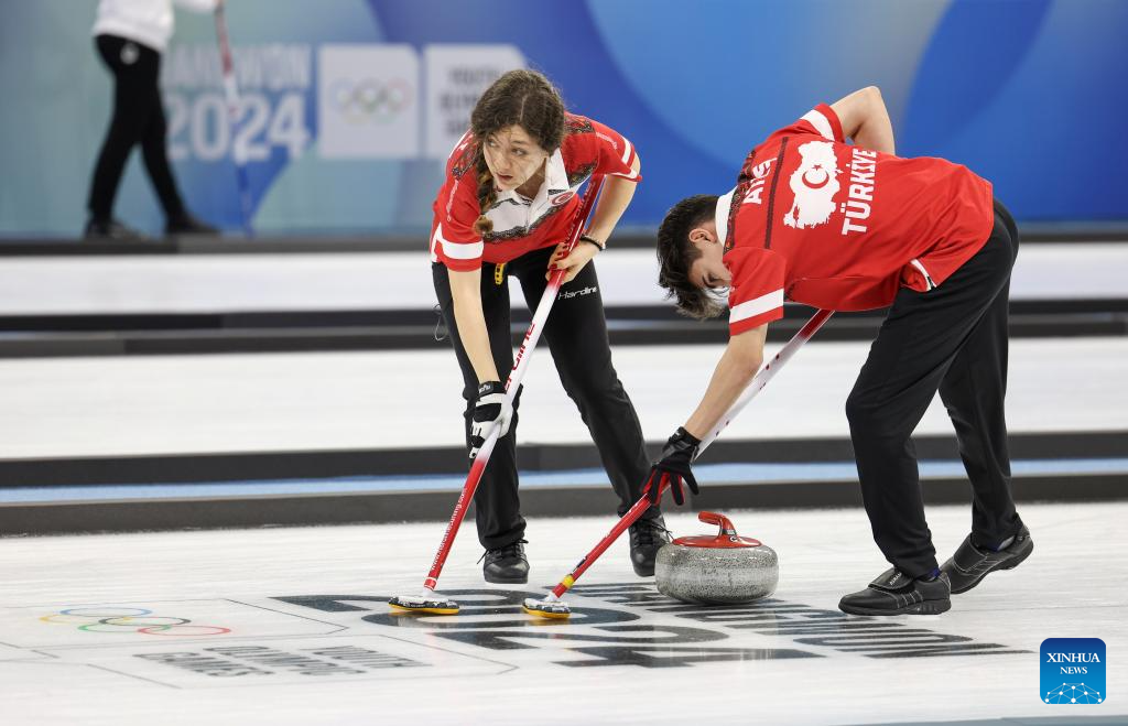 Suheda Karacali (L) and Muhammet Berat Ates of Trkiye compete during the curling mixed team round robin session 1 match between Trkiye and China at the Gangwon 2024 Winter Youth Olympic Games at Gangneung Curling Centre, South Korea, Jan. 20, 2024. (Xinhua/Hu Huhu)