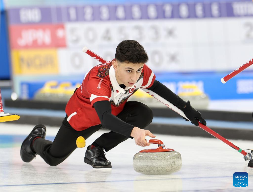 Muhammed Taha Zenit of Trkiye competes during the curling mixed team round robin session 1 match between Trkiye and China at the Gangwon 2024 Winter Youth Olympic Games at Gangneung Curling Centre, South Korea, Jan. 20, 2024. (Xinhua/Hu Huhu)