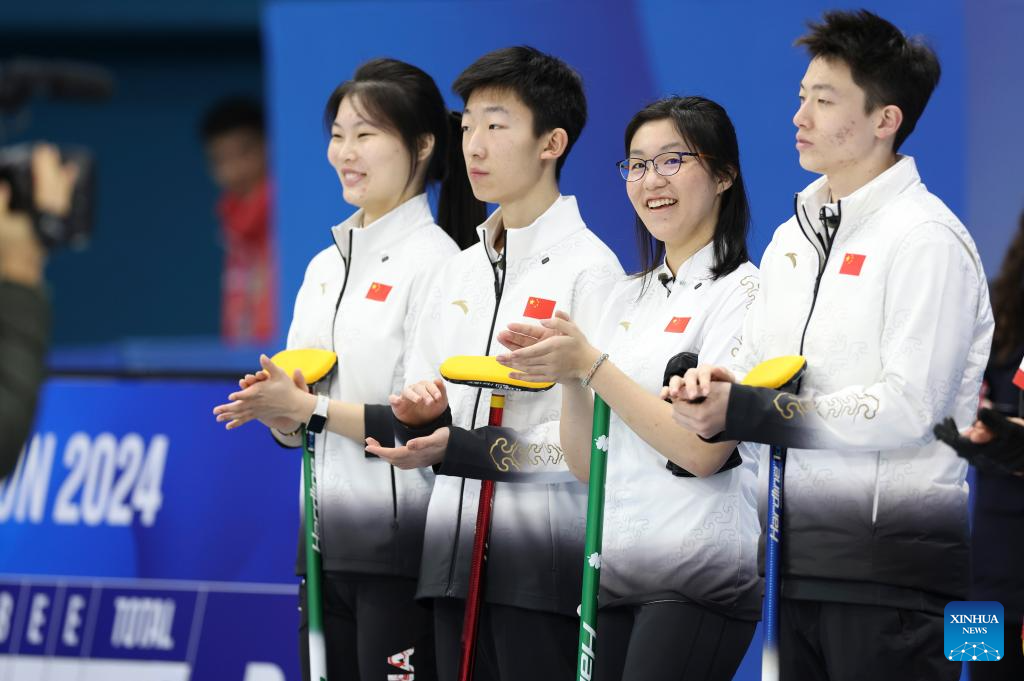 Team China compete during the curling mixed team round robin session 1 match between Trkiye and China at the Gangwon 2024 Winter Youth Olympic Games at Gangneung Curling Centre, South Korea, Jan. 20, 2024. (Xinhua/Hu Huhu)