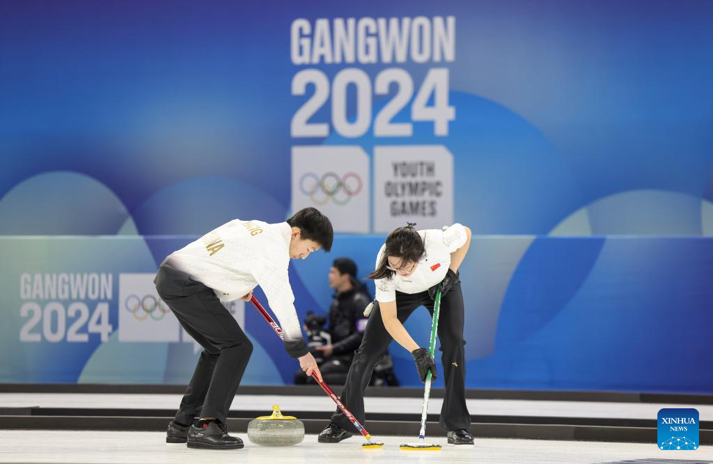 Zhang Minghang (L) and Chen Zaoxue of China compete during the curling mixed team round robin session 1 match between Trkiye and China at the Gangwon 2024 Winter Youth Olympic Games at Gangneung Curling Centre, South Korea, Jan. 20, 2024. (Xinhua/Hu Huhu)