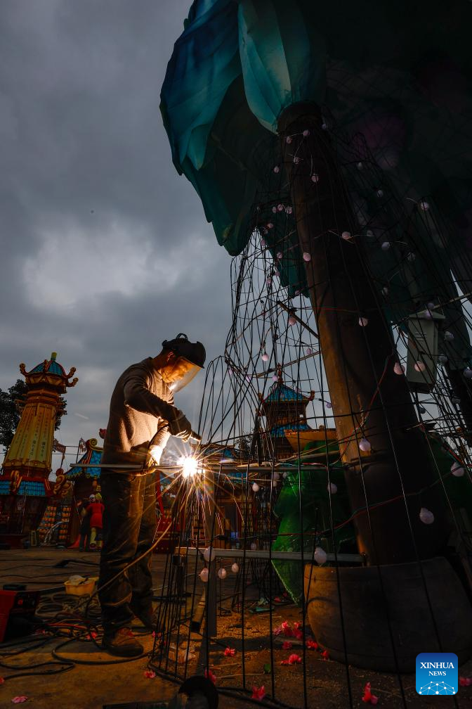 A staff member welds a lantern at the site of upcoming lantern show in Zigong, southwest China's Sichuan Province, Jan. 18, 2024. The 30th International Dinosaur Lantern Show will kick off here on Feb. 2. (Xinhua/Shen Bohan)
