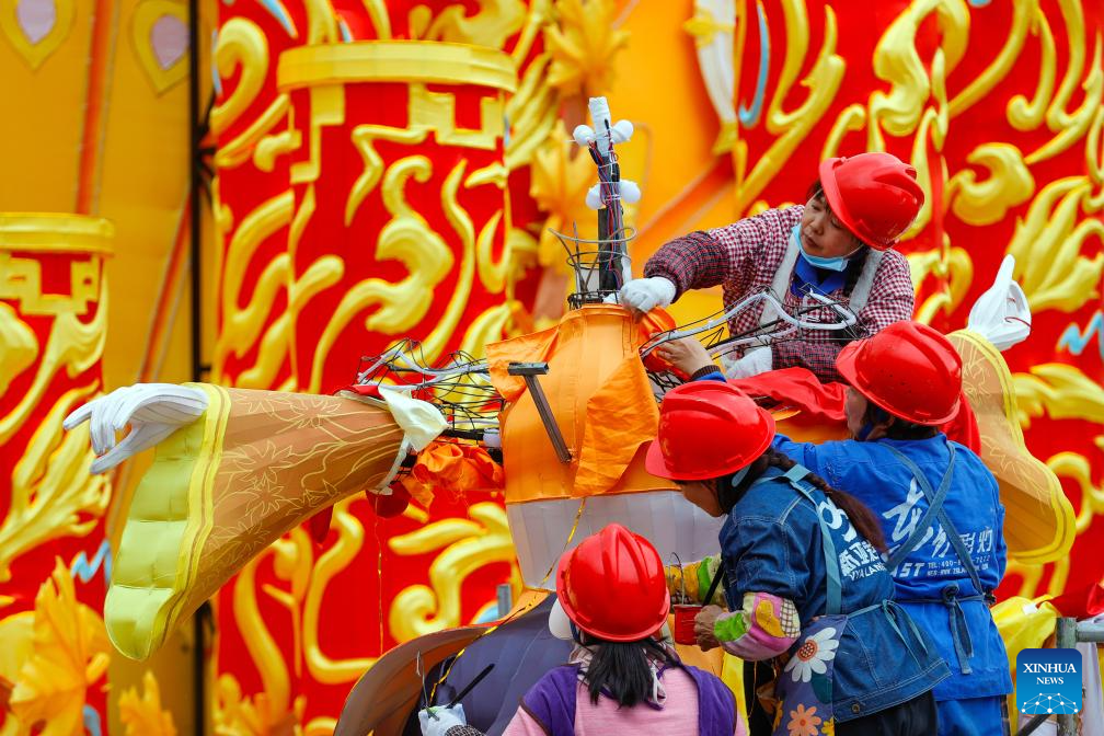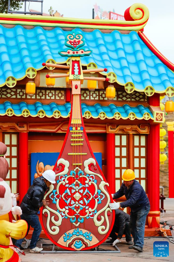 Staff members install a colored lantern at the site of upcoming lantern show in Zigong, southwest China's Sichuan Province, Jan. 18, 2024. The 30th International Dinosaur Lantern Show will kick off here on Feb. 2. (Xinhua/Shen Bohan)