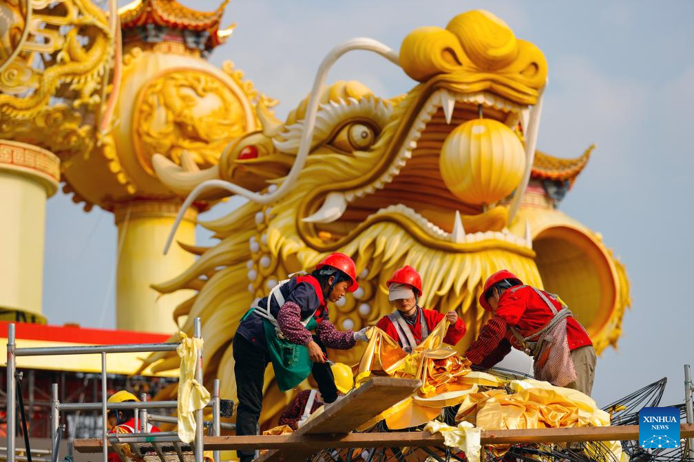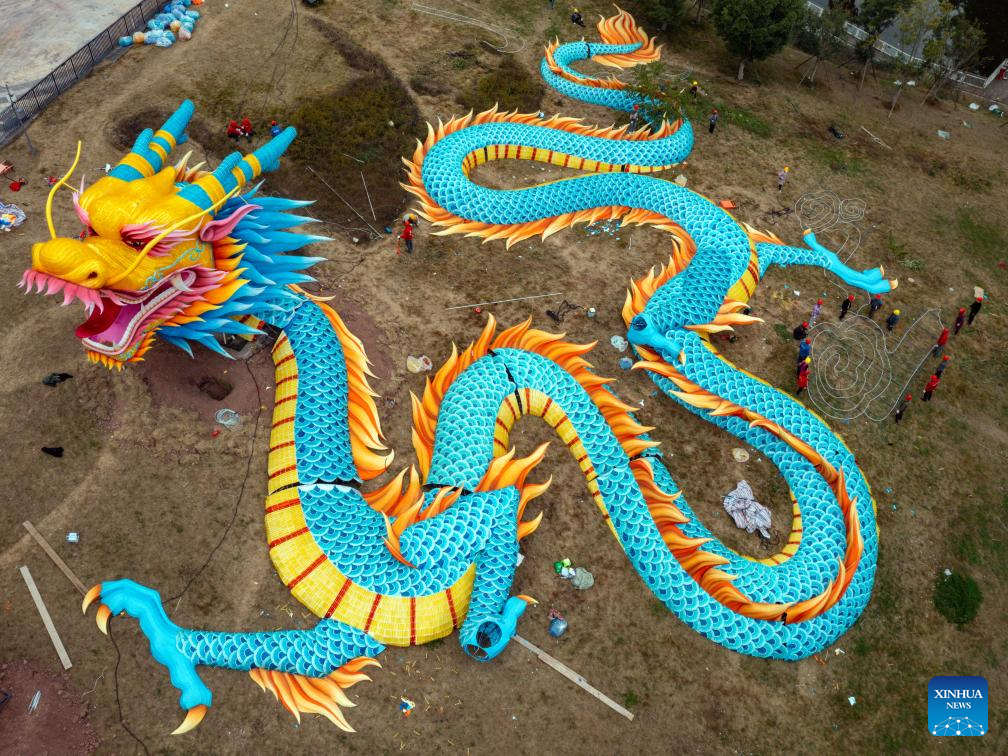 An aerial drone photo taken on Jan. 18, 2024 shows staff members installing a large dragon lantern, whose main part is made from recycled plastic bottles, at the site of upcoming lantern show in Zigong, southwest China's Sichuan Province. The 30th International Dinosaur Lantern Show will kick off here on Feb. 2. (Xinhua/Shen Bohan)