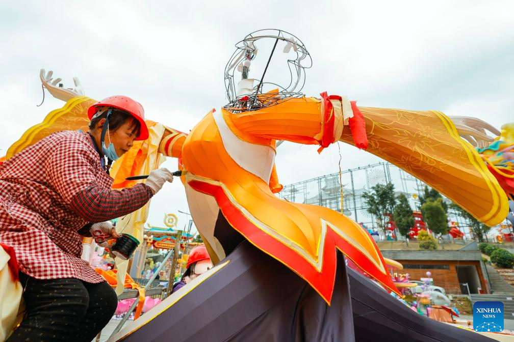 Staff members make a colored lantern at the site of upcoming lantern show in Zigong, southwest China's Sichuan Province, Jan. 18, 2024. The 30th International Dinosaur Lantern Show will kick off here on Feb. 2. (Xinhua/Shen Bohan)