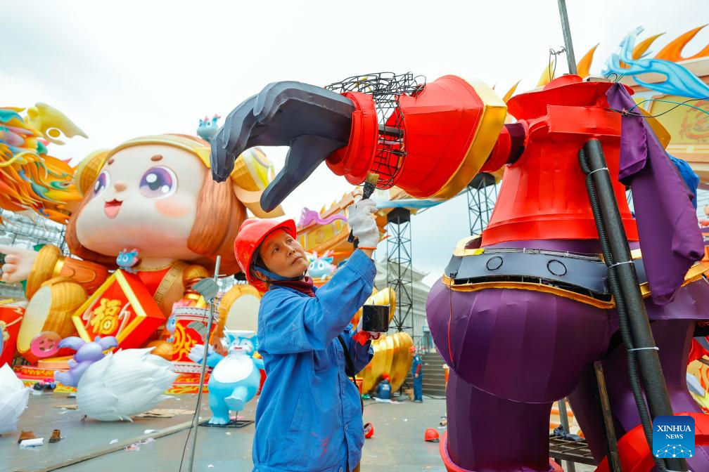 A staff member makes a colored lantern at the site of upcoming lantern show in Zigong, southwest China's Sichuan Province, Jan. 18, 2024. The 30th International Dinosaur Lantern Show will kick off here on Feb. 2. (Xinhua/Shen Bohan)