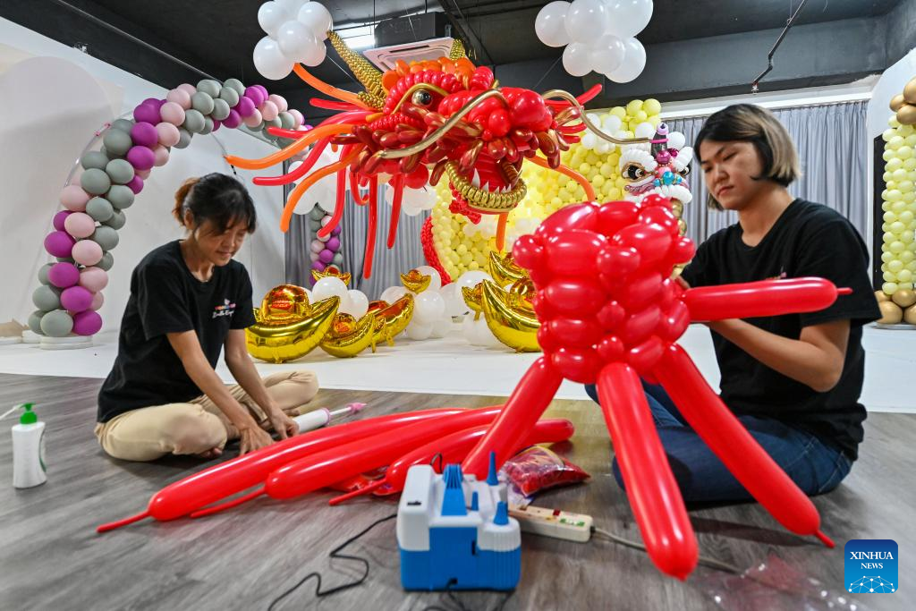 Syndy Tan (R) uses balloons to build a dragon-shaped installation in Kuala Lumpur, Malaysia, on Jan. 18, 2024. In celebration of the upcoming Chinese zodiac Year of the Dragon, Tan, who is good at balloon creations, has used over 600 balloons to build the vivid "dragon." (Photo by Chong Voon Chung/Xinhua)