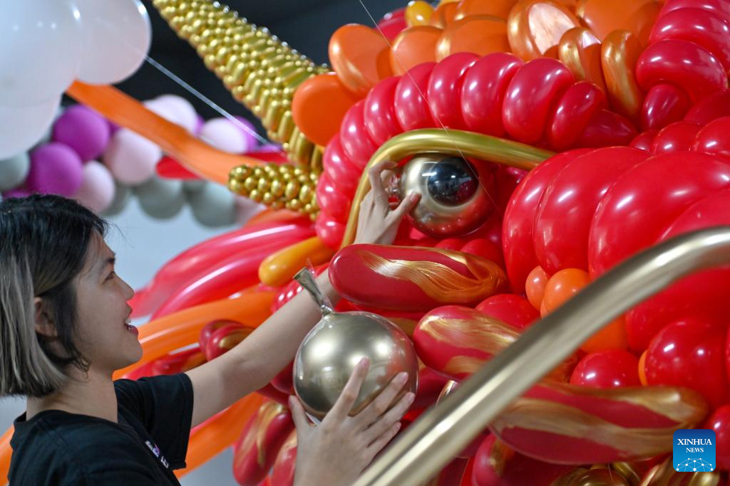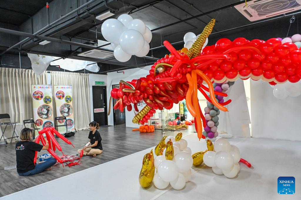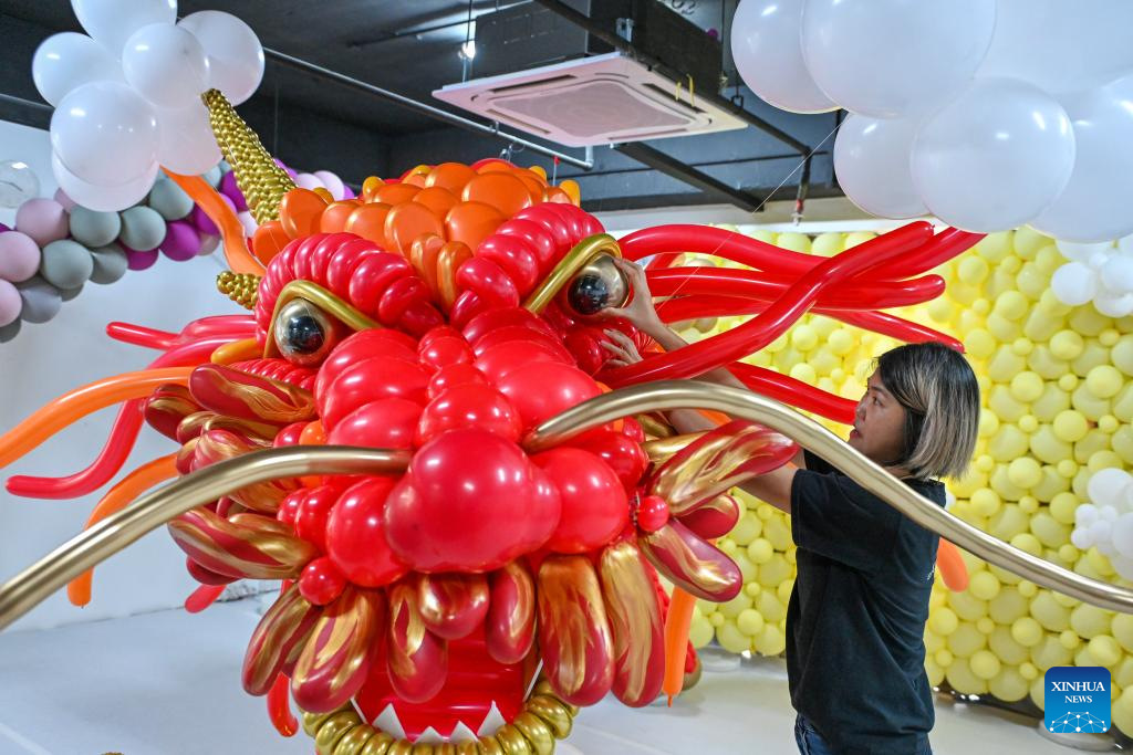Syndy Tan uses balloons to build a dragon-shaped installation in Kuala Lumpur, Malaysia, on Jan. 18, 2024. In celebration of the upcoming Chinese zodiac Year of the Dragon, Tan, who is good at balloon creations, has used over 600 balloons to build the vivid "dragon." (Photo by Chong Voon Chung/Xinhua)
