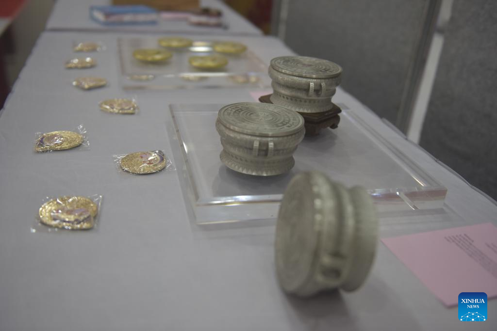 Exhibits are seen at a Chinese and Cambodian cultural exhibition in Phnom Penh, Cambodia, Jan. 21, 2024. A China-Cambodia "Beauty of Intangible Heritage" exhibition kicked off here in the Cambodian capital on Sunday, captivating hundreds of visitors. (Photo by Liao Hongqing/Xinhua)