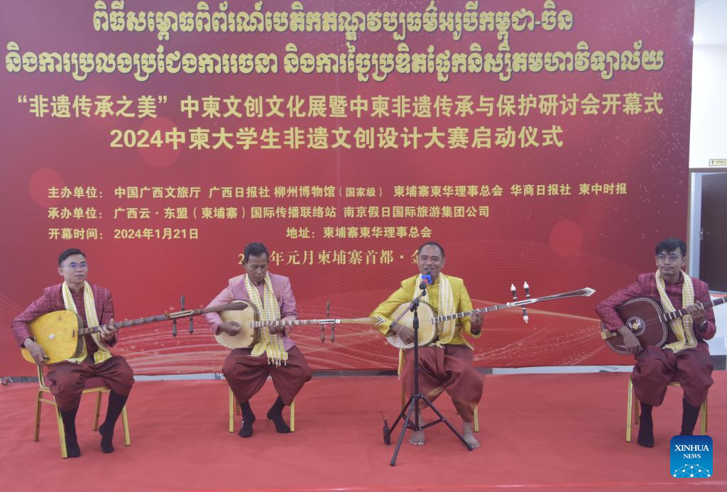Cambodian inheritors of intangible cultural heritage perform Chapei Dang Veng in Phnom Penh, Cambodia, Jan. 21, 2024. A China-Cambodia "Beauty of Intangible Heritage" exhibition kicked off here in the Cambodian capital on Sunday, captivating hundreds of visitors. (Photo by Liao Hongqing/Xinhua)