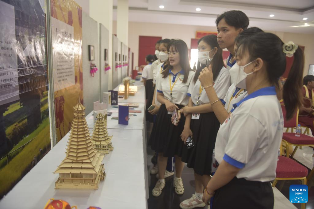 Students visit a Chinese and Cambodian cultural exhibition in Phnom Penh, Cambodia, Jan. 21, 2024. A China-Cambodia "Beauty of Intangible Heritage" exhibition kicked off here in the Cambodian capital on Sunday, captivating hundreds of visitors. (Photo by Liao Hongqing/Xinhua)