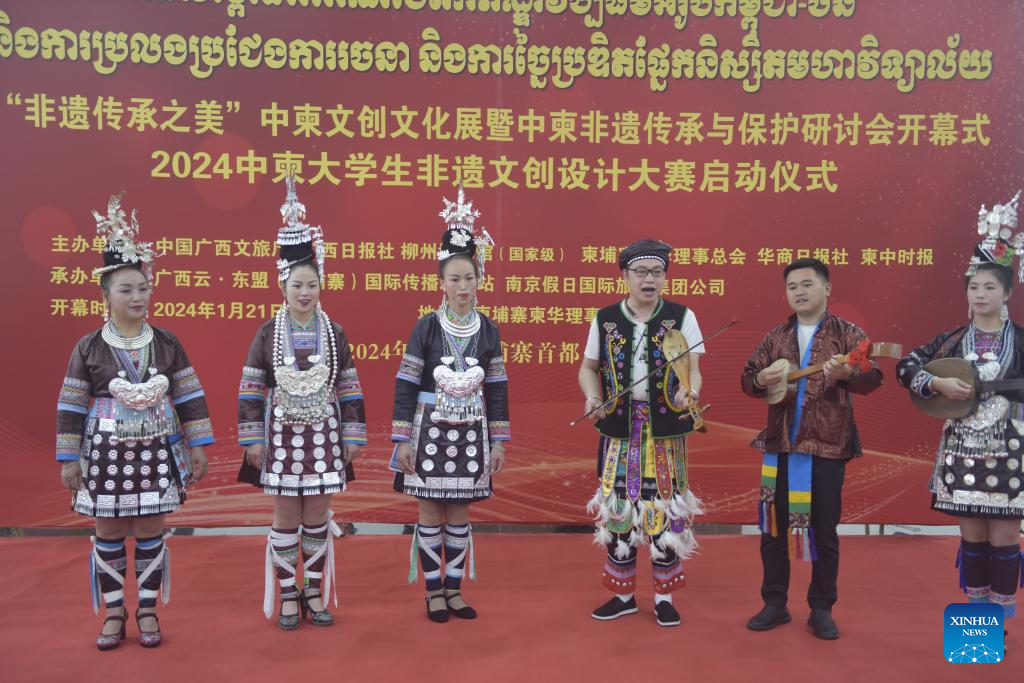 PHNOM PENH, Jan. 21 (Xinhua) -- A China-Cambodia "Beauty of Intangible Heritage" exhibition kicked off here in the Cambodian capital on Sunday, captivating hundreds of visitors.