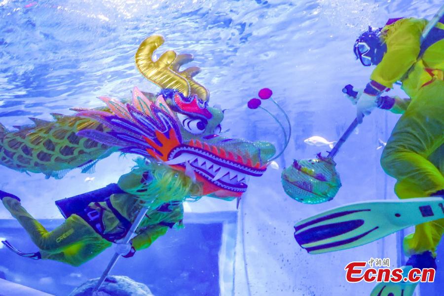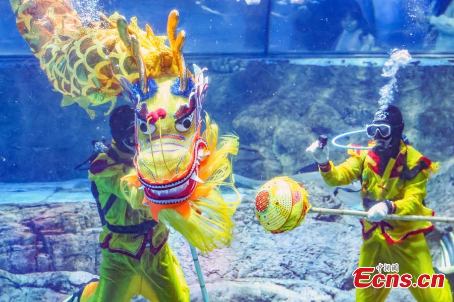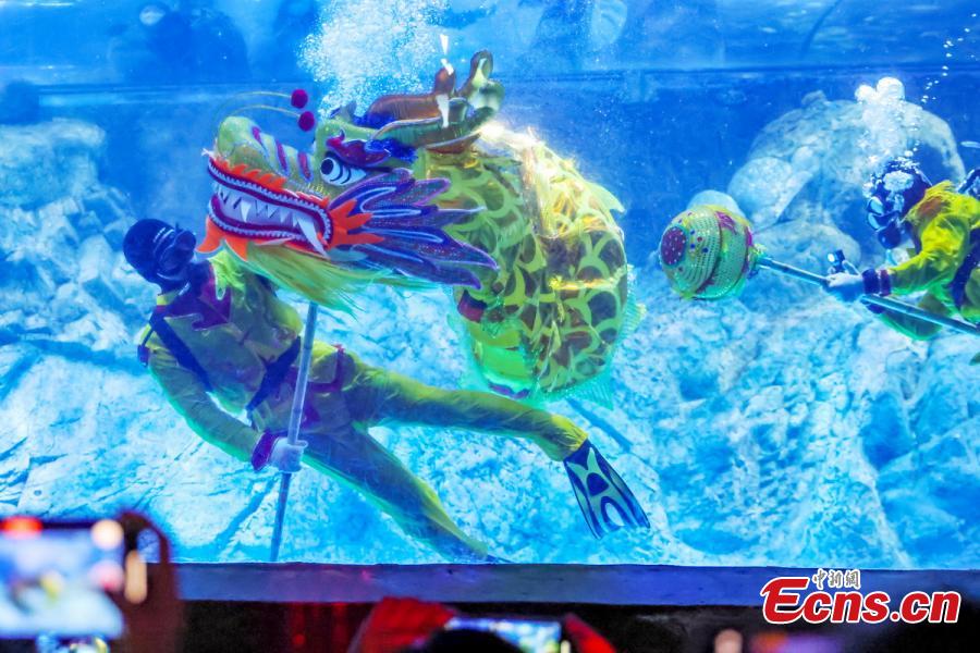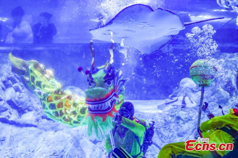 Divers perform underwater dragon dance to celebrate the upcoming Spring Festival at Nanjing Underwater World in east China's Jiangsu Province, Jan. 20, 2024. (Photo: China News Service/Yang Bo)