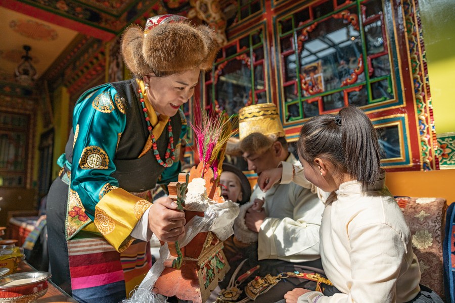 Pasang Butri's daughter Tsering Butri (1st L) prepares chema box for her family members at home in Xigaze, southwest China's Xizang Autonomous Region, Jan. 12, 2024. (Photo by Tenzin Nyida/Xinhua)