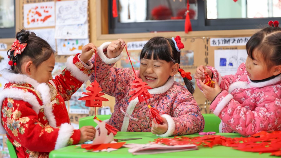 Children make paper cutting works at a kindergarten in Yuping Dong Autonomous County of Tongren City, southwest China's Guizhou Province, Jan. 16, 2024. (Photo by Hu Panxue/Xinhua)