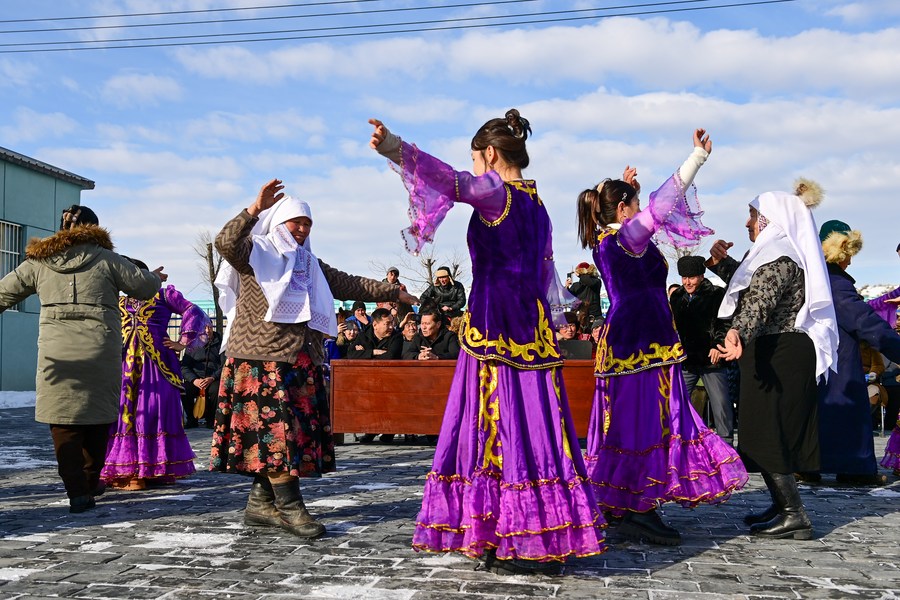 Herdsmen dance at a service station in Emin County, northwest China's Xinjiang Uygur Autonomous Region, Jan. 11, 2024. (Xinhua/Ding Lei)