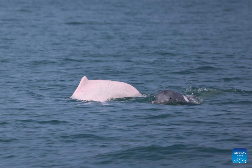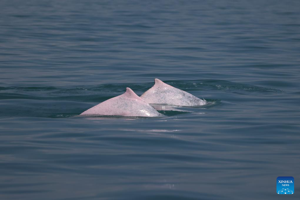 Chinese white dolphins are seen at sea to the southwest of Hainan Island, south China, Jan. 19, 2024. The Chinese white dolphin, nicknamed "giant panda in the sea", lives mainly in sea areas in southeast China and is guarded under first-class state protection. (Xinhua)