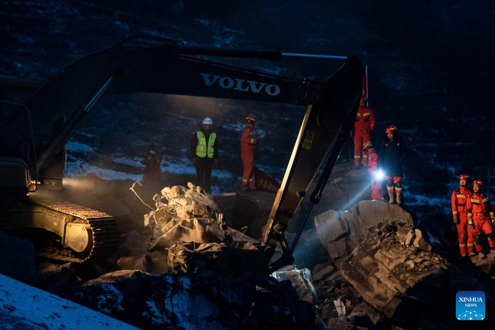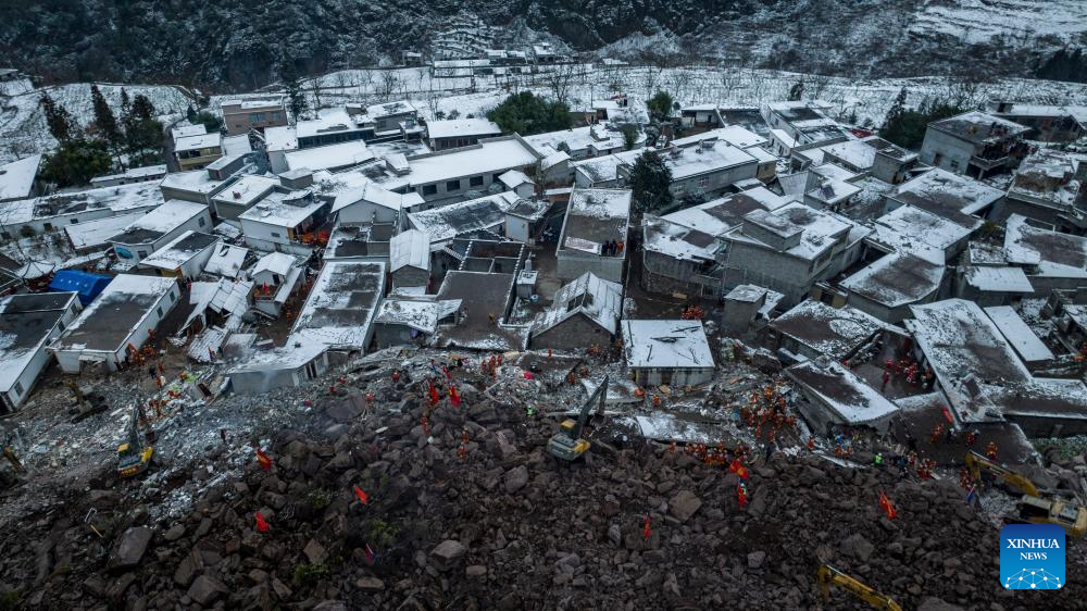 Rescuers work at the site of a landslide in Liangshui Village, Tangfang Town in the city of Zhaotong, southwest China's Yunnan Province, Jan. 22, 2024. (Xinhua/Hu Chao)