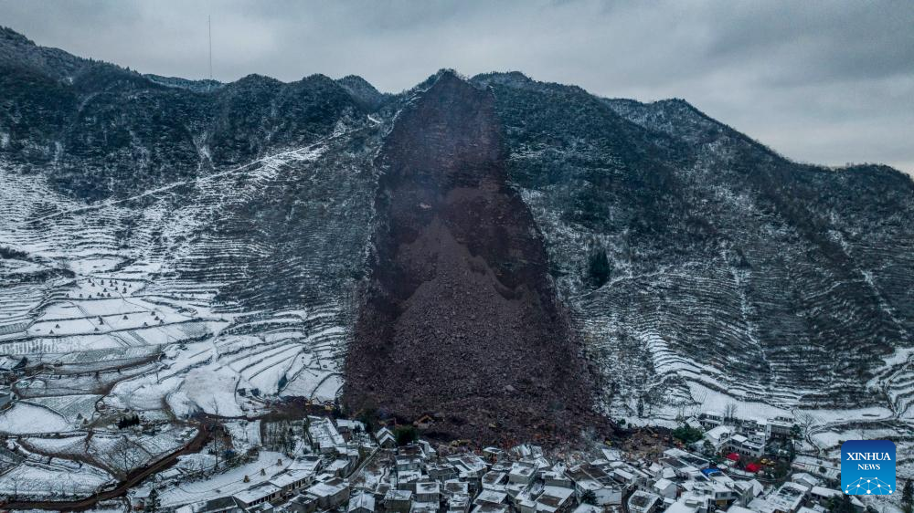 An aerial drone photo taken on Jan. 22, 2024 shows the site of a landslide in Liangshui Village, Tangfang Town in the city of Zhaotong, southwest China's Yunnan Province. (Xinhua/Hu Chao)