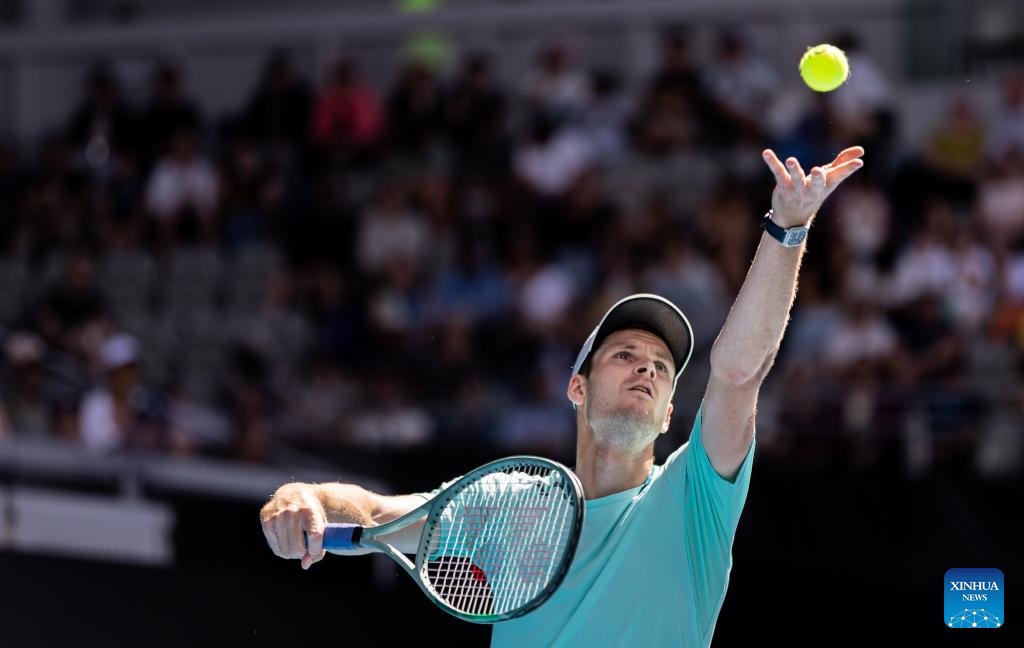 Hubert Hurkacz of Poland serves during the men's singles 4th round match between Hubert Hurkacz of Poland and Arthur Cazaux of France at the Australian Open tennis tournament in Melbourne, Australia, Jan. 22, 2024. (Photo by Hu Jingchen/Xinhua)
