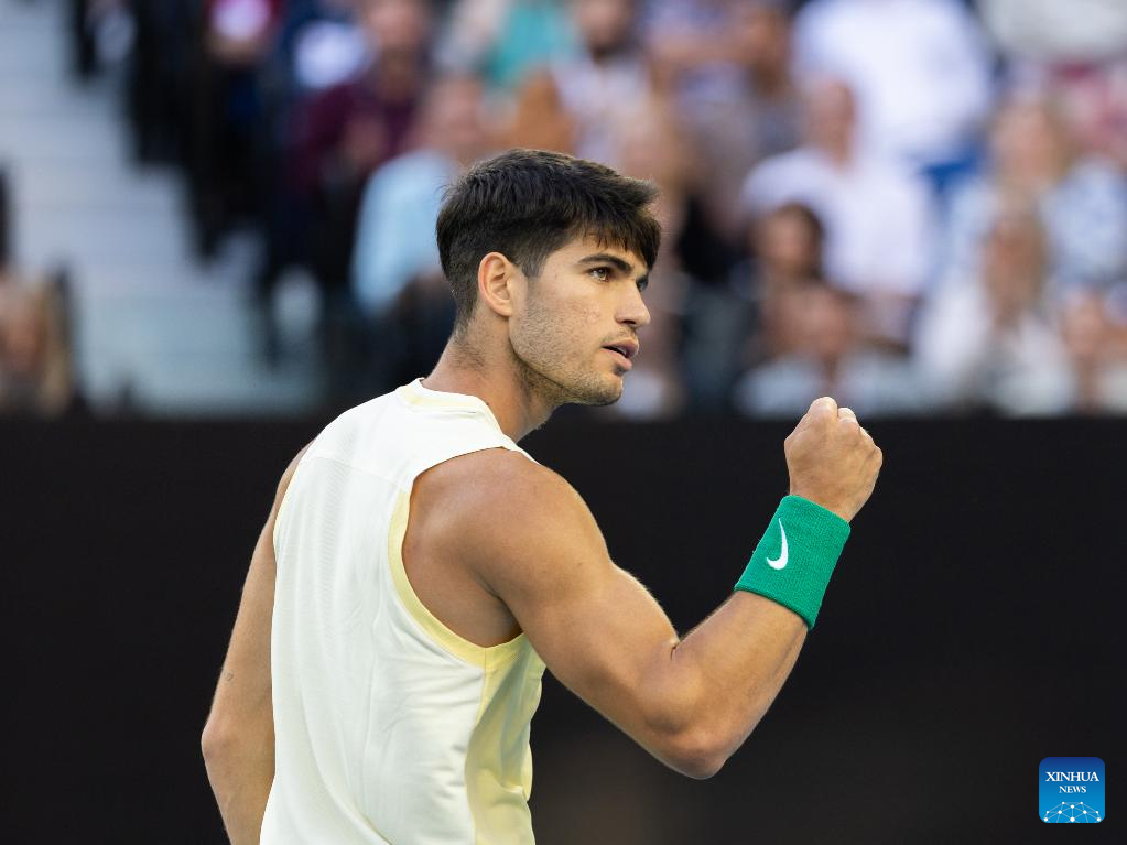 Carlos Alcaraz celebrates during the men's singles 4th round match between Carlos Alcaraz of Spain and Miomir Kecmanovic of Serbia at Australian Open tennis tournament in Melbourne, Australia, Jan. 22, 2024. (Photo by Hu Jingchen/Xinhua)