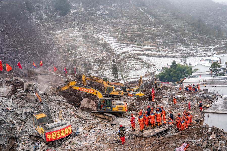 Rescuers work at the site of a landslide in Liangshui Village, Tangfang Town in the city of Zhaotong, southwest China's Yunnan Province, Jan. 23, 2024. (Xinhua/Hu Chao)