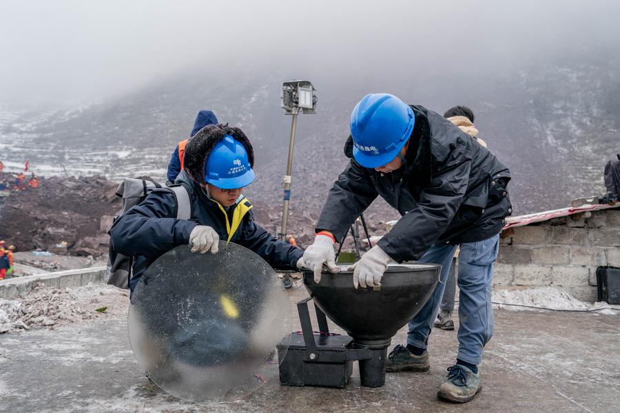 Rescuers set up the lighting equipment in Liangshui Village, Tangfang Town in the city of Zhaotong, southwest China's Yunnan Province, Jan. 23, 2024. (Xinhua/Hu Chao)
