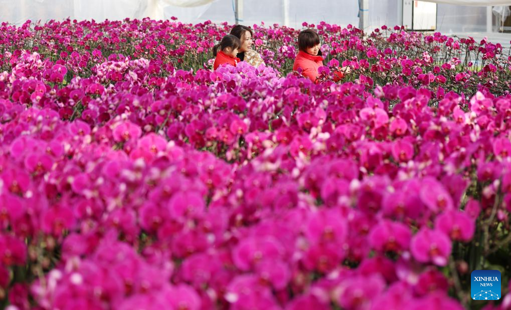 People shop for flowers at a floral expo garden in Tancheng County, east China's Shandong Province, Jan. 23, 2024. Various events are held across the country in celebration of the upcoming Chinese Lunar New Year, which falls on Feb. 10 this year. (Photo by Zhang Chunlei/Xinhua)