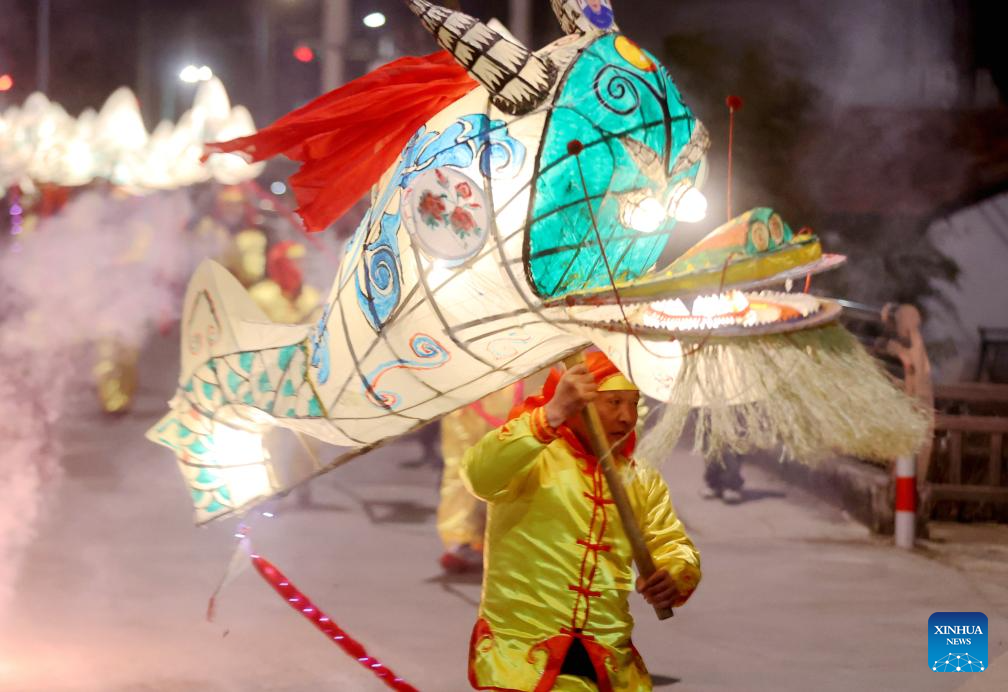 Villagers perform folk dance in Fatou Village of Huzhou City, east China's Zhejiang Province, Jan. 22, 2024. Various events are held across the country in celebration of the upcoming Chinese Lunar New Year, which falls on Feb. 10 this year. (Photo by Xie Shangguo/Xinhua)