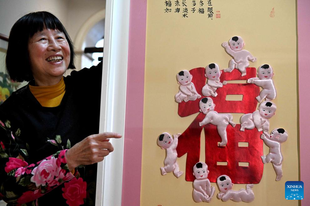 A folk artist shows a New Year picture she made from cloth in Shijiazhuang, north China's Hebei Province, Jan. 23, 2024. Various events are held across the country in celebration of the upcoming Chinese Lunar New Year, which falls on Feb. 10 this year. (Photo by Chen Qibao/Xinhua)