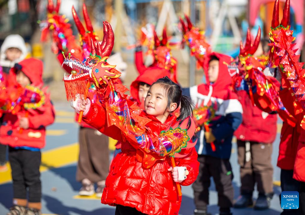 Children perform dragon dance in Haian City, east China's Jiangsu Province, Jan. 23, 2024. Various events are held across the country in celebration of the upcoming Chinese Lunar New Year, which falls on Feb. 10 this year. (Photo by Zhai Huiyong/Xinhua)