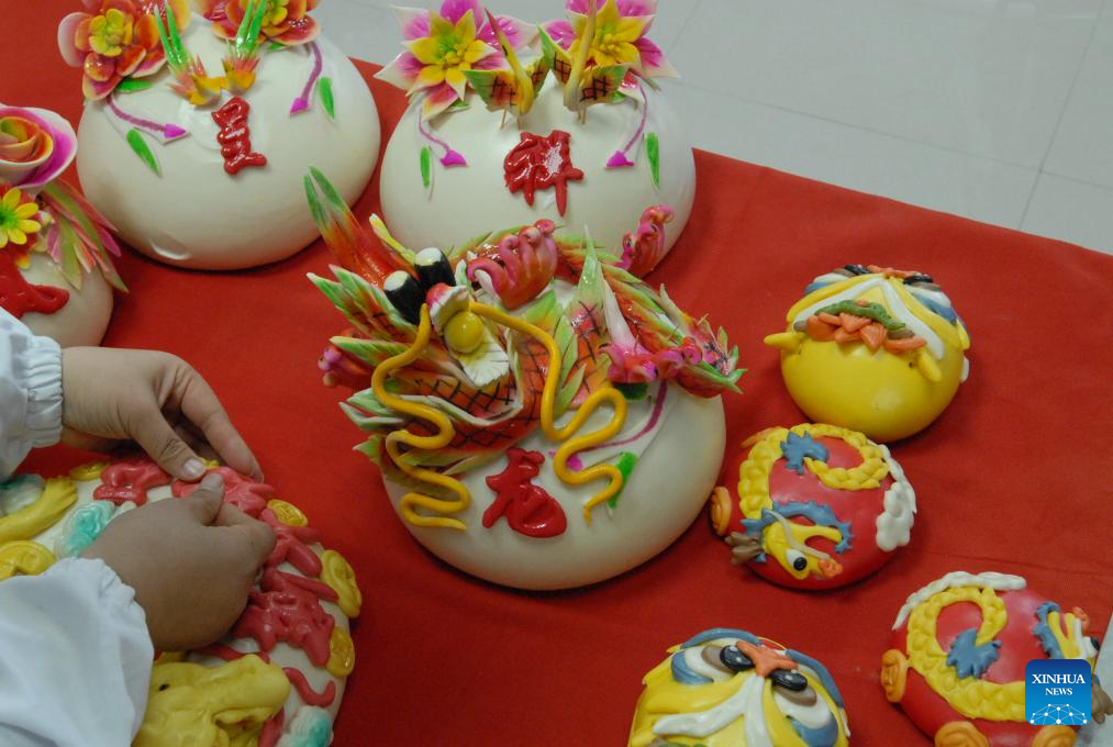 A villager makes artistic steamed buns in Wangsuzhuang Village of Qingdao City, east China's Shandong Province, Jan. 23, 2024. Various events are held across the country in celebration of the upcoming Chinese Lunar New Year, which falls on Feb. 10 this year. (Photo by Zhang Tao/Xinhua)