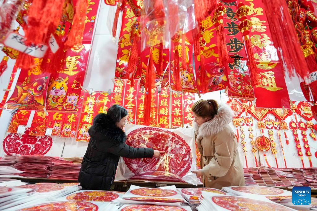 Spring Festival decorations are on sale at a local market in Yutian County, north China's Hebei Province, Jan. 23, 2024. Various events are held across the country in celebration of the upcoming Chinese Lunar New Year, which falls on Feb. 10 this year. (Photo by Liu Mancang/Xinhua)